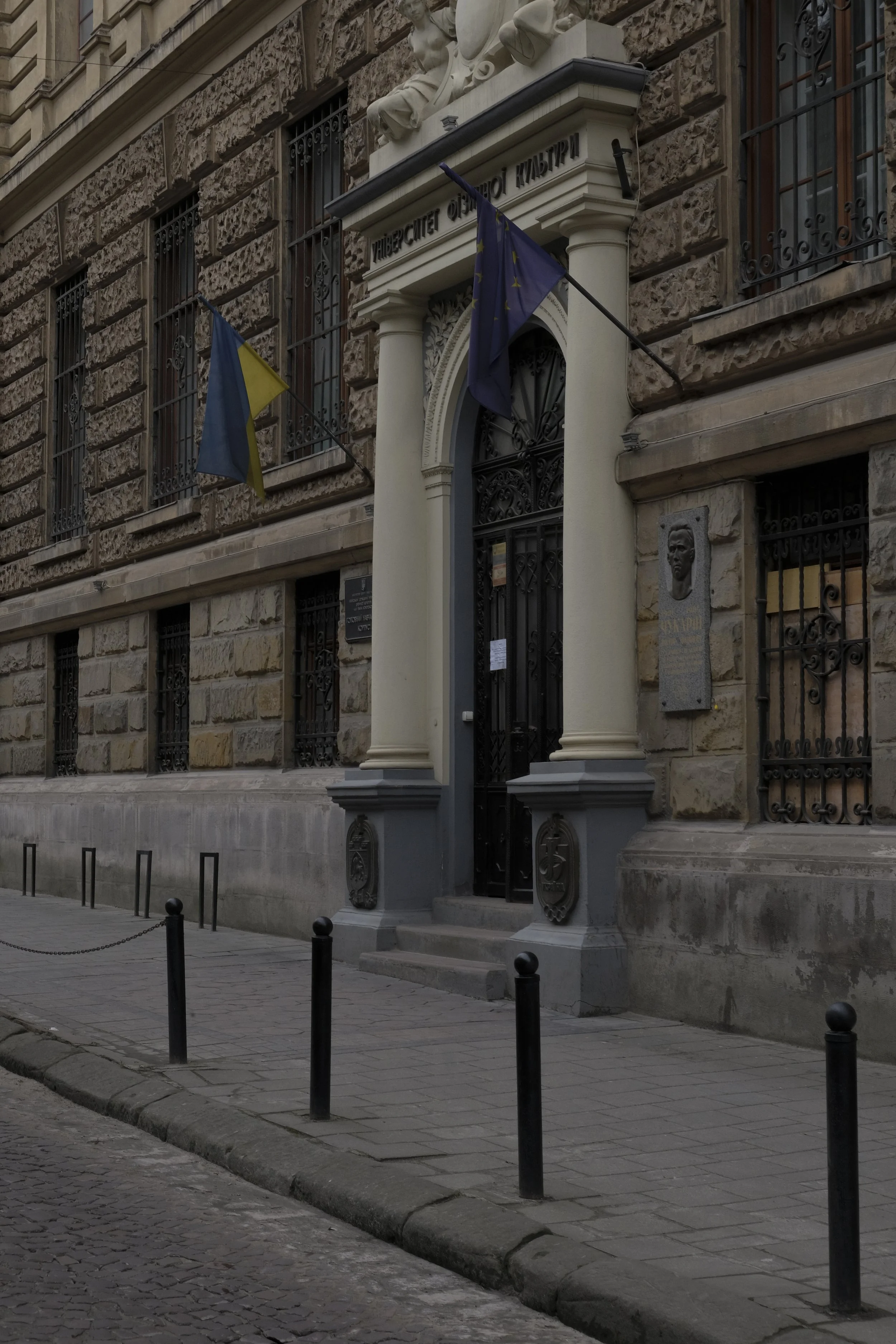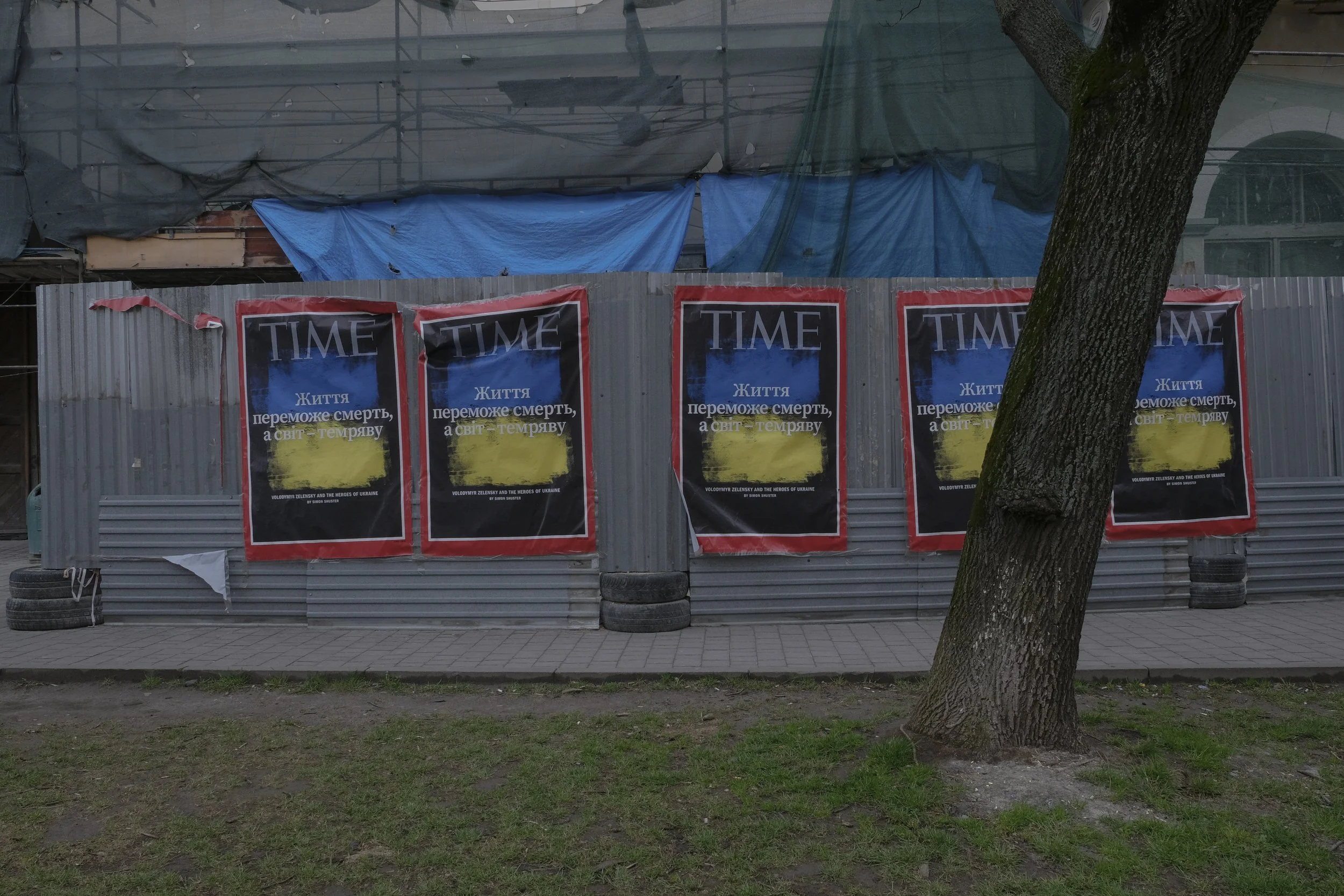 Posters of the US news magazine Time on a construction site façade in downtown Lviv. The title of the special edition is: ‘Life triumphs over death and light over darkness’ written by Simon Schuster. —Lviv, Ukraine, 2022